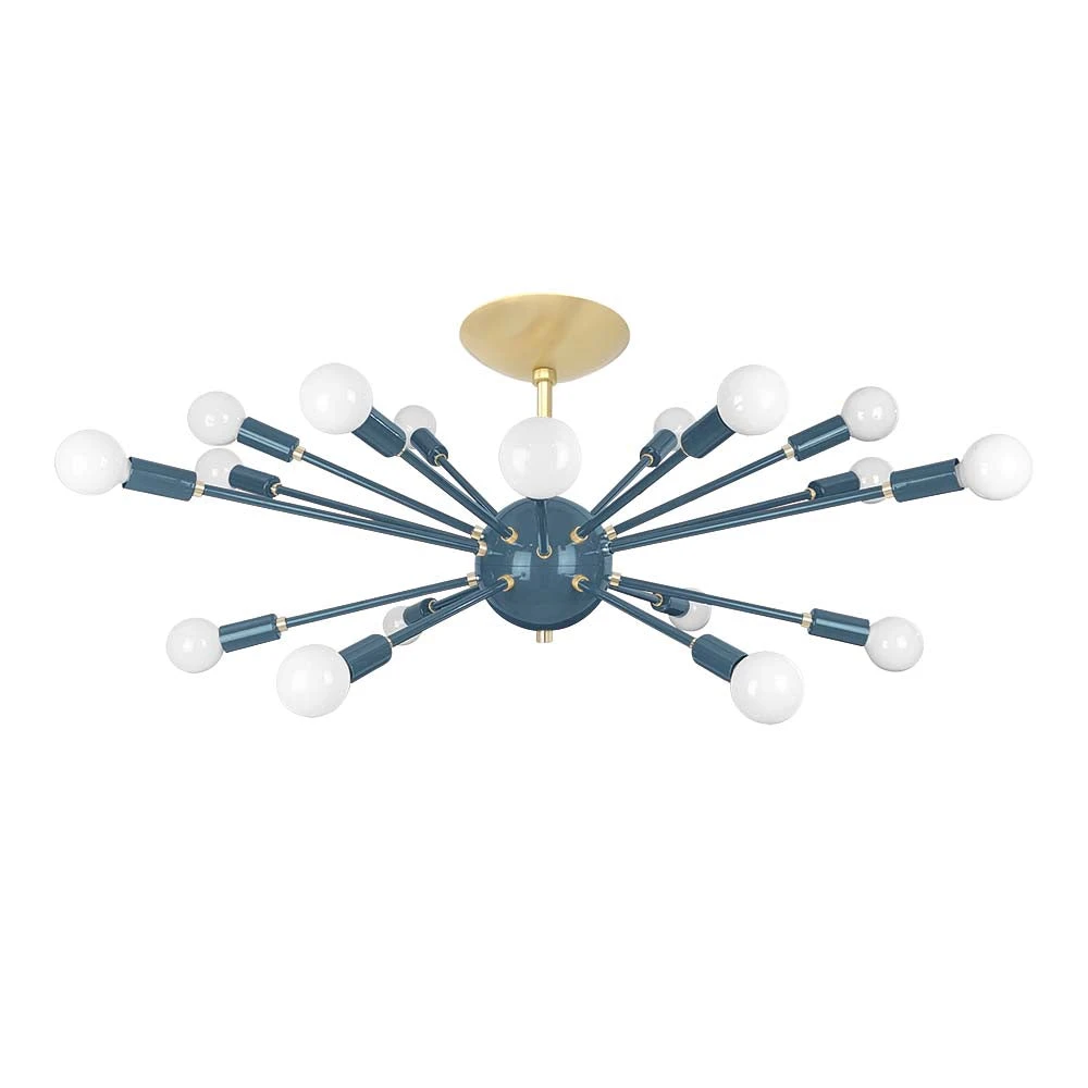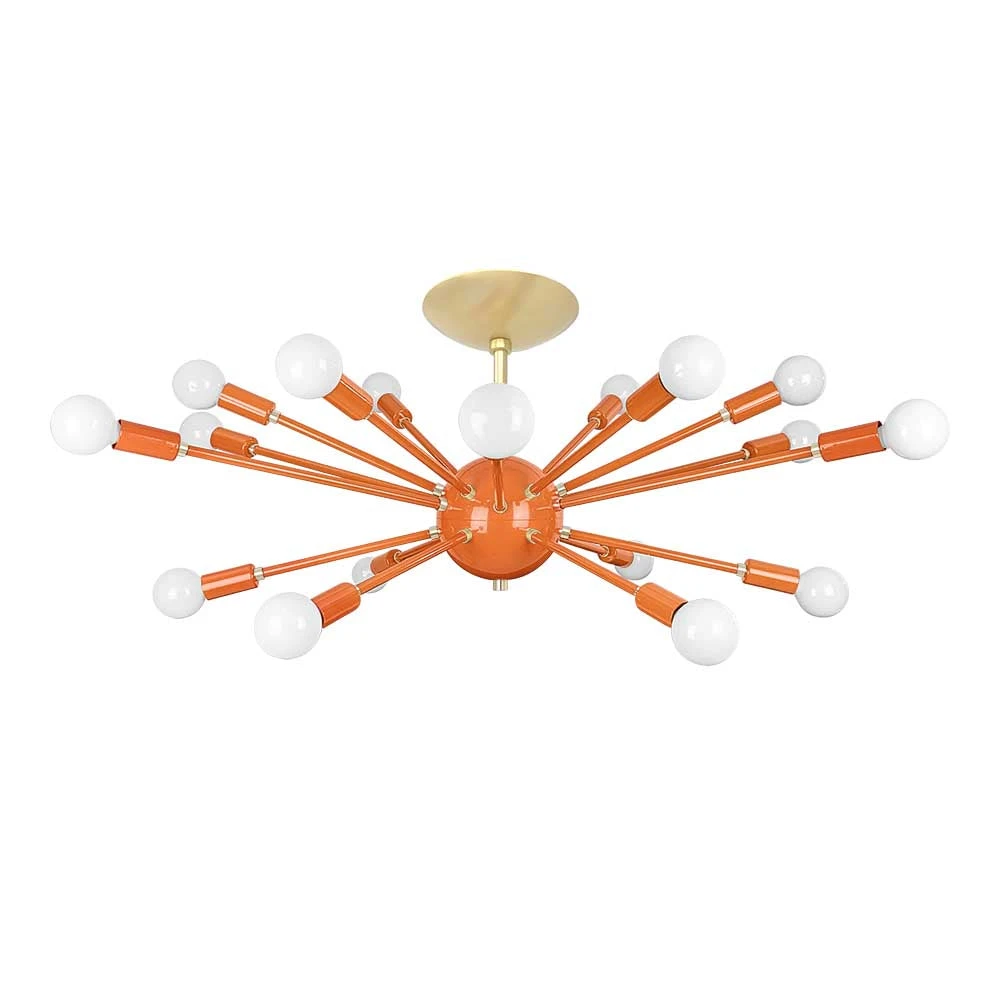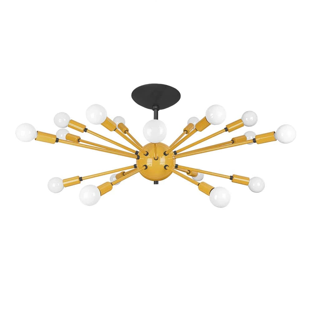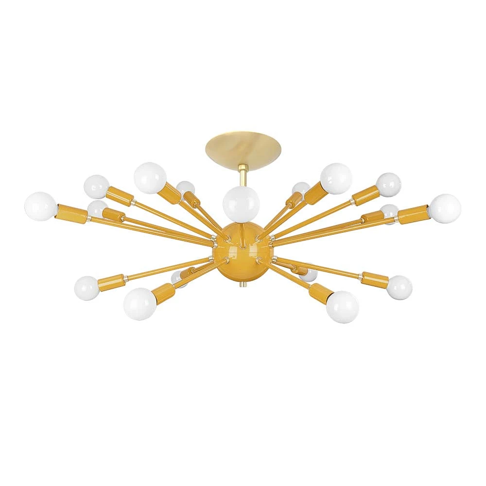 This Elliptical Sputnik Flush Mount is the ultimate colorful lighting statement piece for thoroughfares and rooms with lower ceilings. From the side the fixture takes on a wide elliptical shape that from below is revealed to be completely round with each of its 18 sockets oriented on varied arms lengths exiting laterally from the core. Also available is our Sputnik Chandelier for taller spaces.