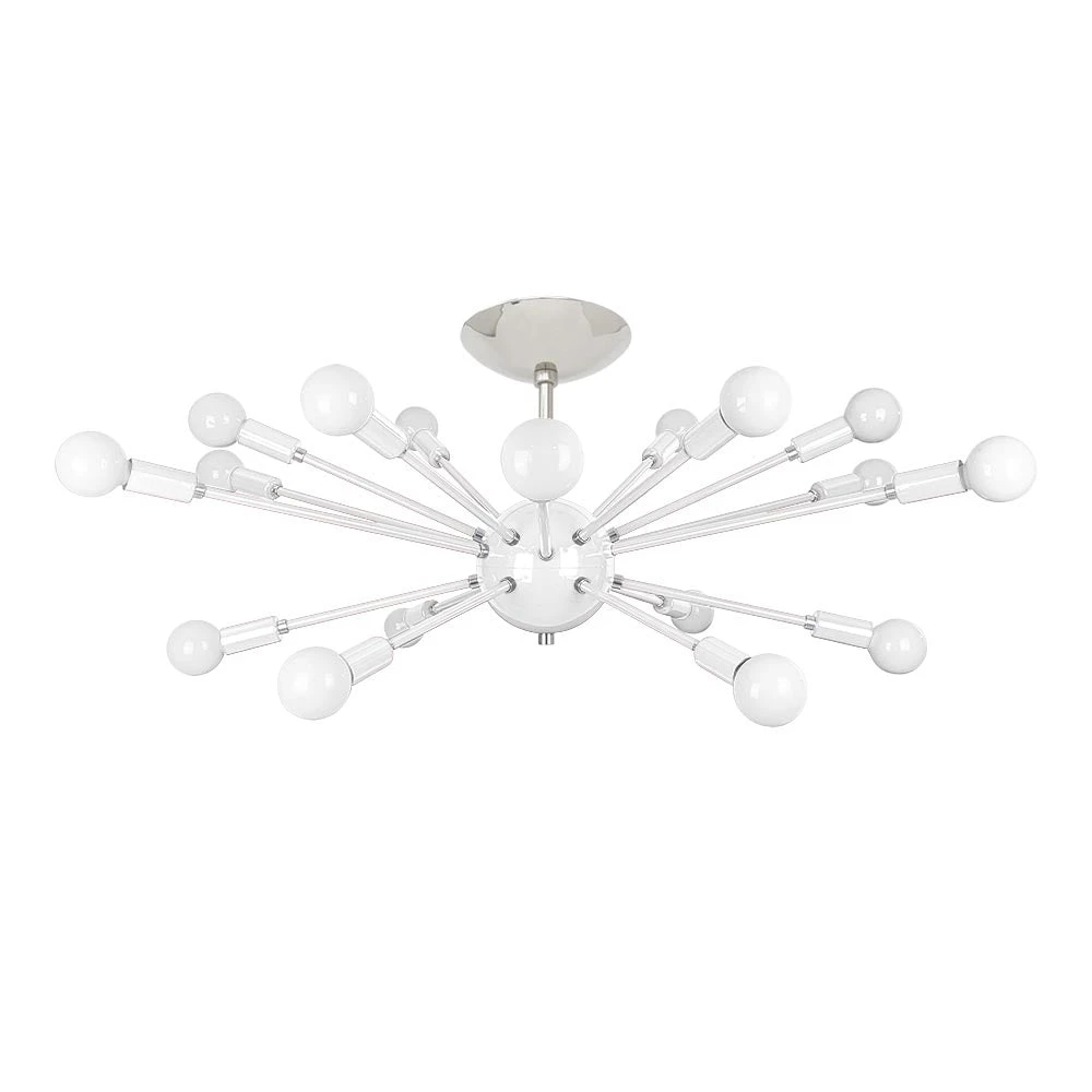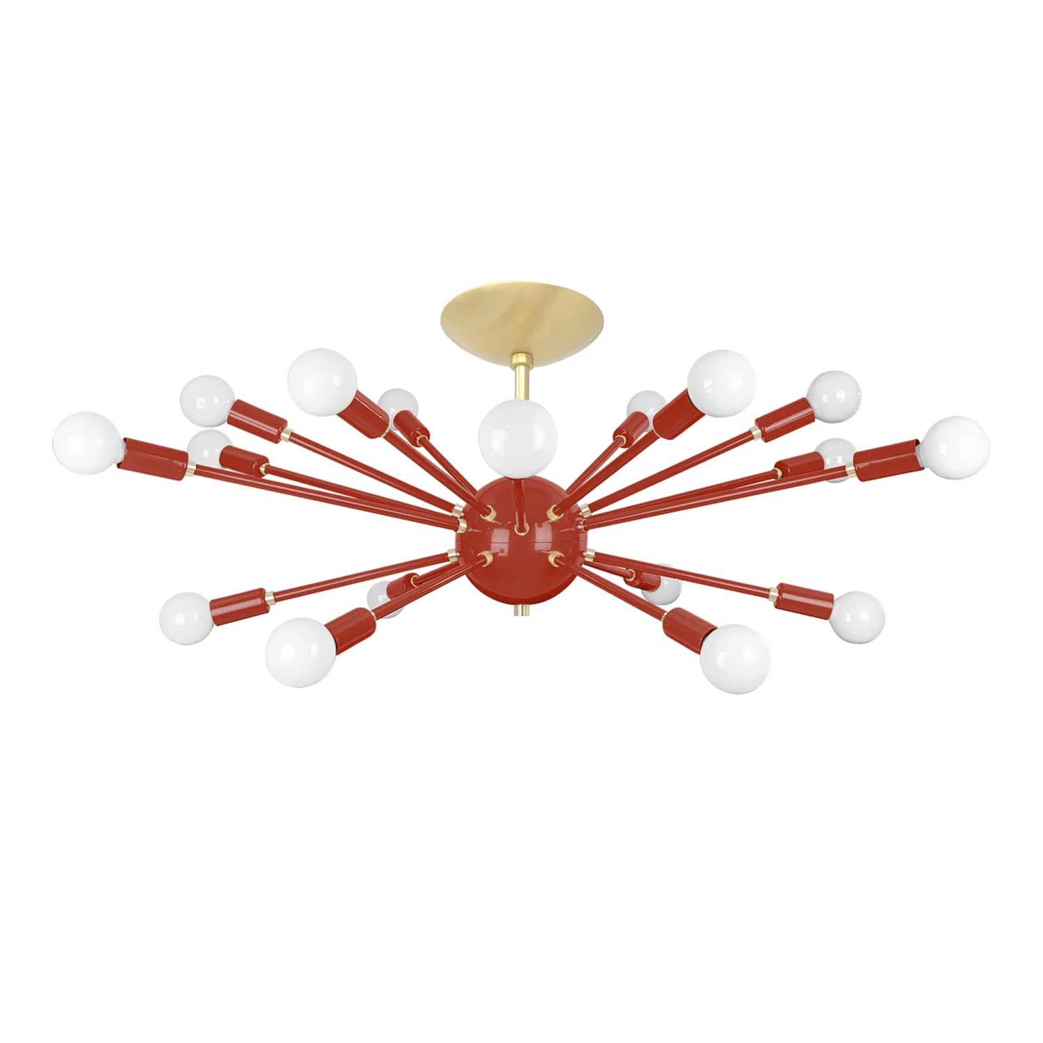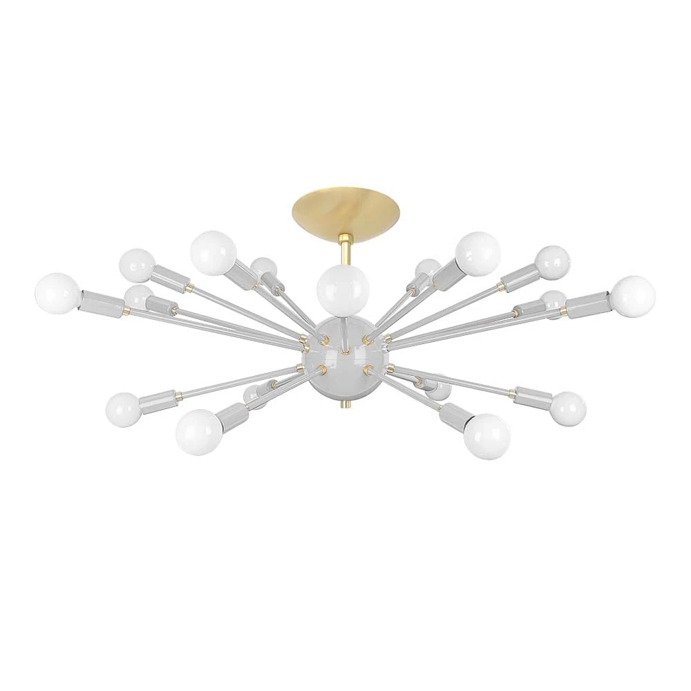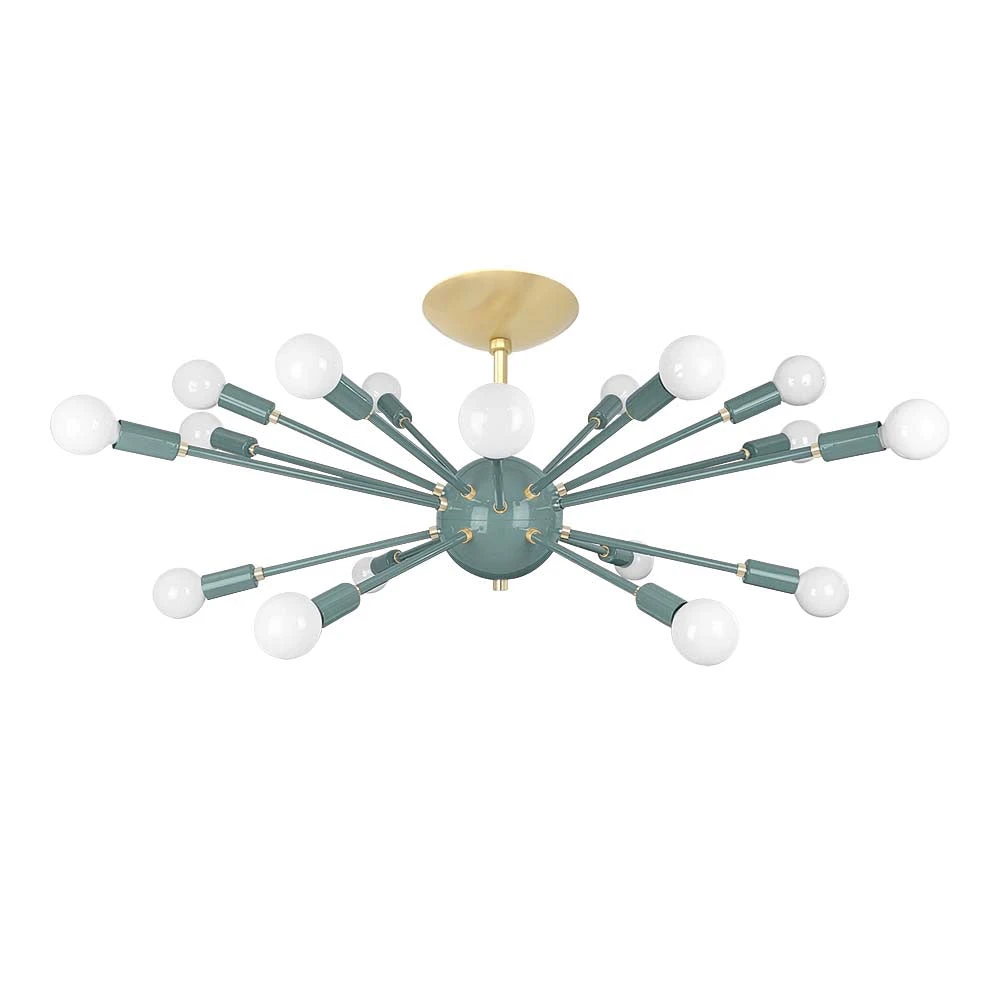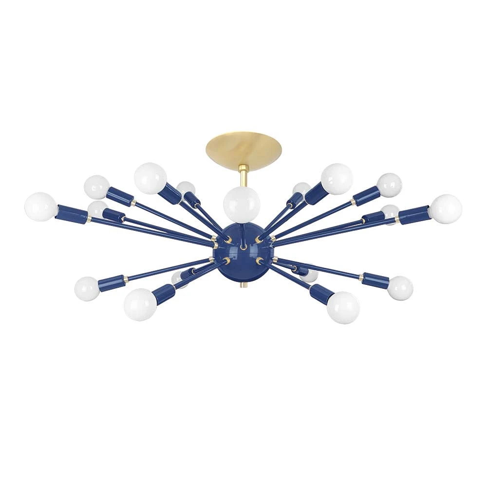 This Elliptical Sputnik Flush Mount is the ultimate colorful lighting statement piece for thoroughfares and rooms with lower ceilings. From the side the fixture takes on a wide elliptical shape that from below is revealed to be completely round with each of its 18 sockets oriented on varied arms lengths exiting laterally from the core. Also available is our Sputnik Chandelier for taller spaces.