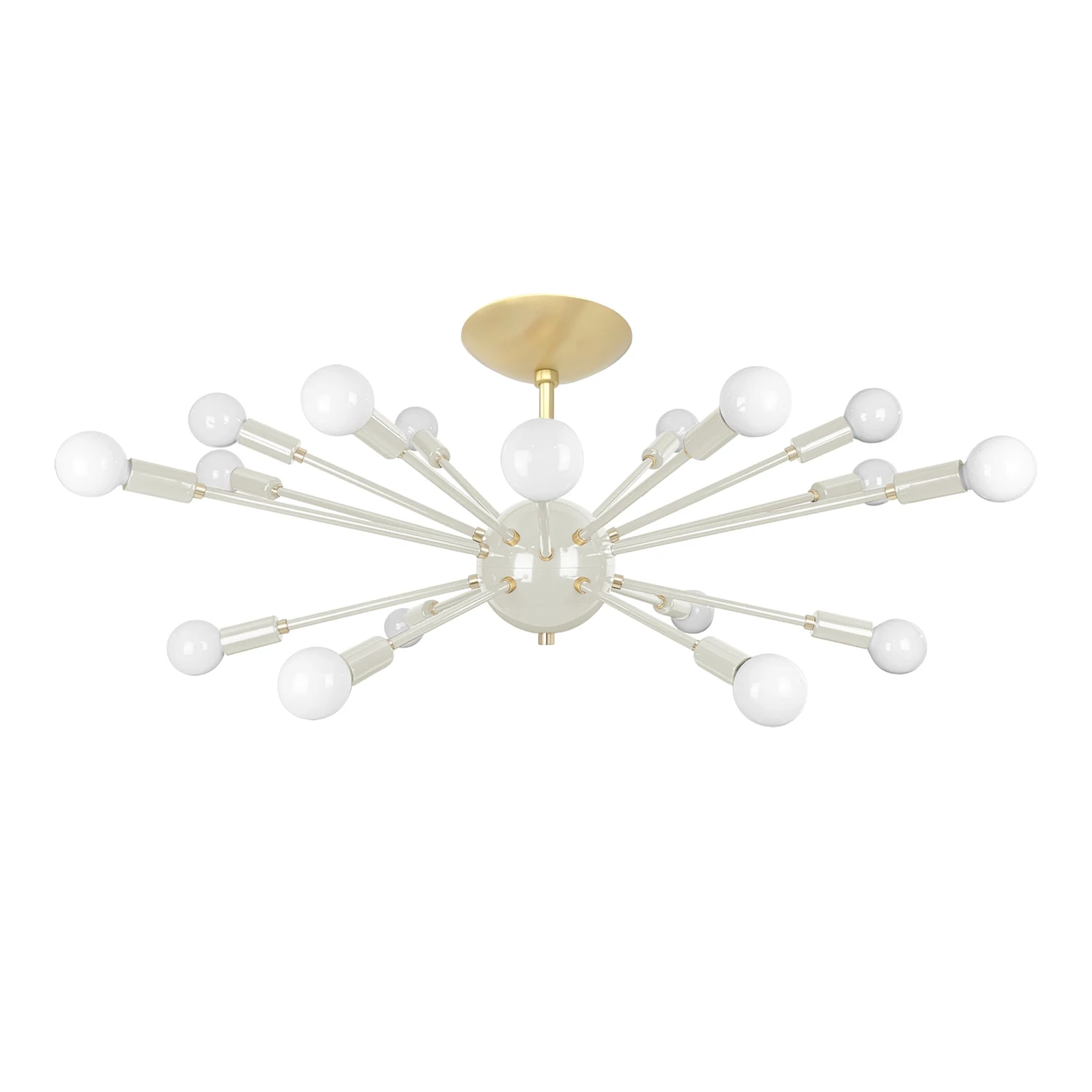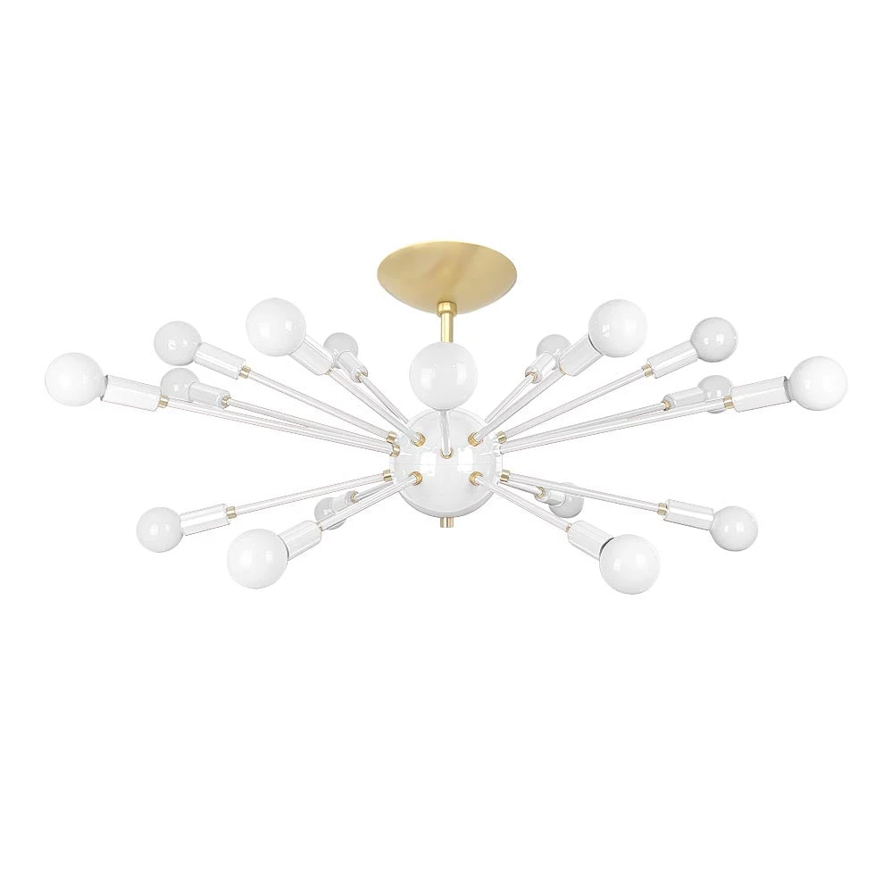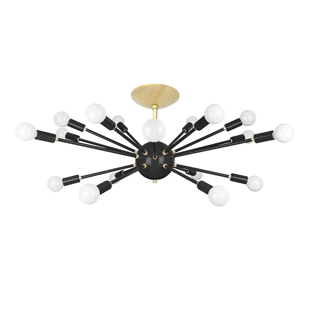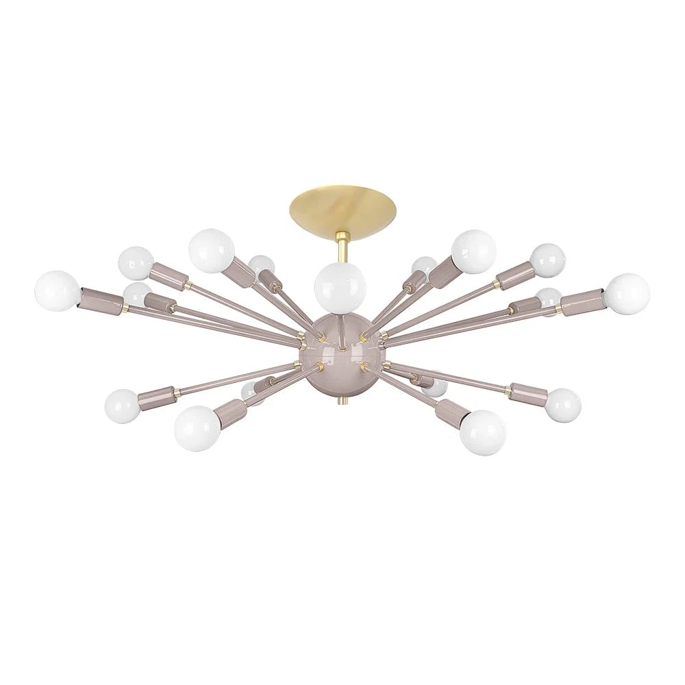 This Elliptical Sputnik Flush Mount is the ultimate colorful lighting statement piece for thoroughfares and rooms with lower ceilings. From the side the fixture takes on a wide elliptical shape that from below is revealed to be completely round with each of its 18 sockets oriented on varied arms lengths exiting laterally from the core. Also available is our Sputnik Chandelier for taller spaces.
