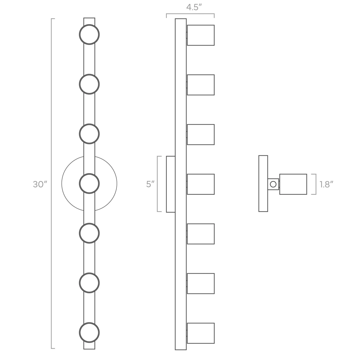 The Color Vogue 7 Sconce is a contemporary interpretation of the oft-seen linear multi-bulb vanity light running the perimeter of a mirror. Our largest wall sconce design, this fixture serves sharp CNC-machined aluminum edges in a linear shape perfect for getting the most out of a single junction box in bathrooms, above vanities, over mirrors, and more.